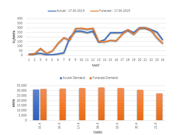 Tahminleme Modeli* analizi sonucu ortalama piyasa takas fiyatı 183.19 TL/MWh ve ortalama tüketim 32,802 MWh olarak öngörülmektedir. Modelin piyasa takas fiyatına dair başarı oranı günlük % 82, tüketime dair başarı oranı** ise günlük % 98 olarak hesaplanırken, bugüne kadar yapılan piyasa takas fiyatına dair analizlere göre başarı oranı % 88, tüketime dair başarı oranı ise % 95 olarak hesaplanmaktadır. Saatlik yarın için oluşan ve tahmin edilen piyasa takas fiyatları ile haftalık bazda tahmin edilen ve gerçekleştikçe yer alacak günlük ortalama tüketim değerleri aşağıdaki grafiklerde yer almaktadır.