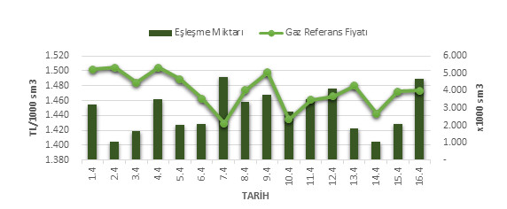 Organize Toptan Doğal Gaz Satış Piyasası (OTSP) dahilinde 01.03.2019 – 16.04.2019 tarihleri arası ortalama Gaz Referans Fiyatı (GRF) 1,473.63 TL/1000 sm3 olarak belirlenirken, aynı tarihler arasında toplam gerçekleşen eşleşmelerin miktarı ise 45,442 x1000 sm3 olarak belirlendi. İlgili tarihler arasında günlük Gaz Referans Fiyatı (GRF) ile Eşleşme Miktarı verileri aşağıdaki grafikte yer almaktadır.