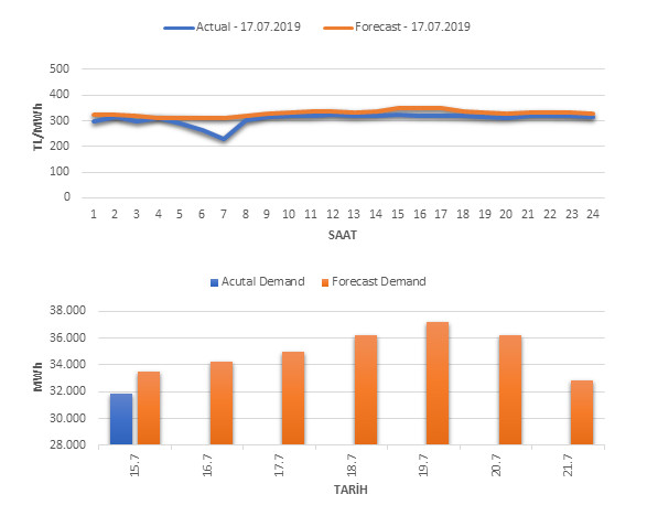 Tahminleme Modeli* analizi sonucu ortalama piyasa takas fiyatı 330.09 TL/MWh ve ortalama tüketim 34,970 MWh olarak öngörülmektedir. Modelin piyasa takas fiyatına dair başarı oranı günlük % 69, tüketime dair başarı oranı** ise günlük % 95 olarak hesaplanırken, bugüne kadar yapılan piyasa takas fiyatına dair analizlere göre başarı oranı % 91, tüketime dair başarı oranı ise % 94 olarak hesaplanmaktadır. Saatlik yarın için oluşan ve tahmin edilen piyasa takas fiyatları ile haftalık bazda tahmin edilen ve gerçekleştikçe yer alacak günlük ortalama tüketim değerleri aşağıdaki grafiklerde yer almaktadır.
