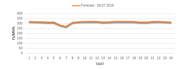 Yarından sonraki gün için oluşacak ortalama piyasa takas fiyatı 313.67 TL/MWH olarak tahmin edilmektedir. Buna bağlı olarak günün maksimum fiyatı 320.04 TL/MWh olarak 14:00 – 15:00 saat aralığında, minimum fiyatı 269.99 TL/MWh olarak 06:00 – 07:00 saat aralığında gerçekleşeceği öngörülmektedir. Puant saatlerde (17:00 – 22:00) tahmini ortalama piyasa takas fiyatı ise 317.2 TL/MWh olarak hesaplanabilmektedir. Saatlik oluşacak piyasa takas fiyatı tahminleri aşağıdaki grafikte yer almaktadır.