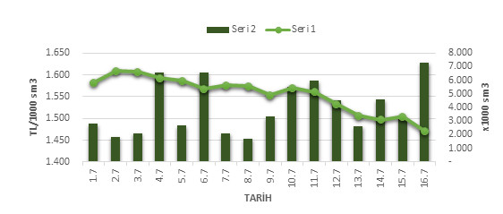 Organize Toptan Doğal Gaz Satış Piyasası (OTSP) dahilinde 01.07.2019 – 16.07.2019 tarihleri arası ortalama Gaz Referans Fiyatı (GRF) 1,555.08 TL/1000 sm3 olarak belirlenirken, aynı tarihler arasında toplam gerçekleşen eşleşmelerin miktarı ise 63,193 x1000 sm3 olarak belirlendi. İlgili tarihler arasında günlük Gaz Referans Fiyatı (GRF) ile Eşleşme Miktarı verileri aşağıdaki grafikte yer almaktadır.