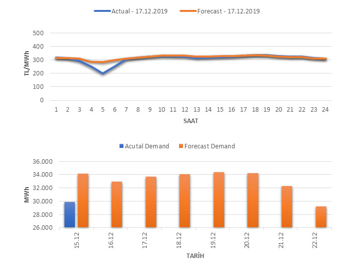 Tahminleme Modeli* analizi sonucu ortalama piyasa takas fiyatı 321.09 TL/MWh ve ortalama tüketim 33,682 MWh olarak öngörülmektedir. Modelin piyasa takas fiyatına dair başarı oranı günlük % 83, tüketime dair başarı oranı** ise günlük % 86 olarak hesaplanırken, bugüne kadar yapılan piyasa takas fiyatına dair analizlere göre başarı oranı % 91, tüketime dair başarı oranı ise % 94 olarak hesaplanmaktadır. Saatlik yarın için oluşan ve tahmin edilen piyasa takas fiyatları ile haftalık bazda tahmin edilen ve gerçekleştikçe yer alacak günlük ortalama tüketim değerleri aşağıdaki grafiklerde yer almaktadır.