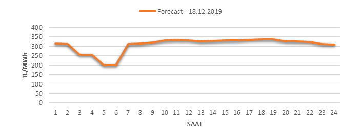 Yarından sonraki gün için oluşacak ortalama piyasa takas fiyatı 307.17 TL/MWH olarak tahmin edilmektedir. Buna bağlı olarak günün maksimum fiyatı 335.01 TL/MWh olarak 17:00 – 18:00 saat aralığında, minimum fiyatı 200.01 TL/MWh olarak 04:00 – 05:00 saat aralığında gerçekleşeceği öngörülmektedir. Puant saatlerde (17:00 – 22:00) tahmini ortalama piyasa takas fiyatı ise 325.43 TL/MWh olarak hesaplanabilmektedir. Saatlik oluşacak piyasa takas fiyatı tahminleri aşağıdaki grafikte yer almaktadır.