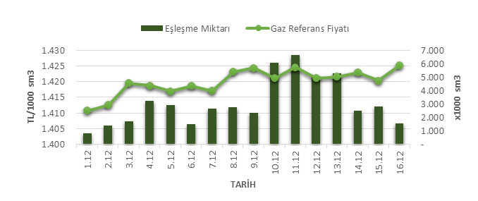 Organize Toptan Doğal Gaz Satış Piyasası (OTSP) dahilinde 01.12.2019 – 16.12.2019 tarihleri arası ortalama Gaz Referans Fiyatı (GRF) 1,419.92 TL/1000 sm3 olarak belirlenirken, aynı tarihler arasında toplam gerçekleşen eşleşmelerin miktarı ise 49,193 x1000 sm3 olarak belirlendi. İlgili tarihler arasında günlük Gaz Referans Fiyatı (GRF) ile Eşleşme Miktarı verileri aşağıdaki grafikte yer almaktadır.