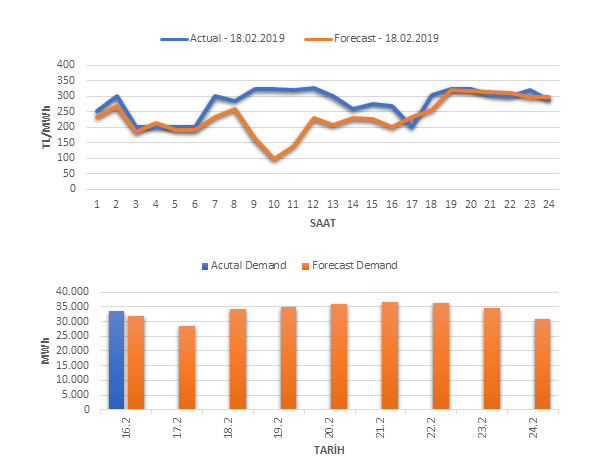Tahminleme Modeli* analizi sonucu ortalama piyasa takas fiyatı 232.85 TL/MWh ve ortalama tüketim 34,277 MWh olarak öngörülmektedir. Modelin piyasa takas fiyatına dair başarı oranı günlük % 37, tüketime dair başarı oranı** ise günlük % 95 olarak hesaplanırken, bugüne kadar yapılan piyasa takas fiyatına dair analizlere göre başarı oranı % 88, tüketime dair başarı oranı ise % 94 olarak hesaplanmaktadır. Saatlik yarın için oluşan ve tahmin edilen piyasa takas fiyatları ile haftalık bazda tahmin edilen ve gerçekleştikçe yer alacak günlük ortalama tüketim değerleri aşağıdaki grafiklerde yer almaktadır.