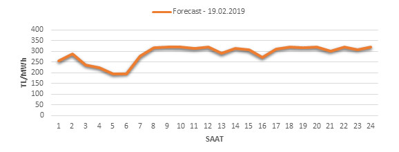 Yarından sonraki gün için oluşacak ortalama piyasa takas fiyatı 289.63 TL/MWH olarak tahmin edilmektedir. Buna bağlı olarak günün maksimum fiyatı 319.73 TL/MWh olarak 08:00 – 09:00 saat aralığında, minimum fiyatı 194.34 TL/MWh olarak 04:00 – 05:00 saat aralığında gerçekleşeceği öngörülmektedir. Puant saatlerde (17:00 – 22:00) tahmini ortalama piyasa takas fiyatı ise 313.93 TL/MWh olarak hesaplanabilmektedir. Saatlik oluşacak piyasa takas fiyatı tahminleri aşağıdaki grafikte yer almaktadır.