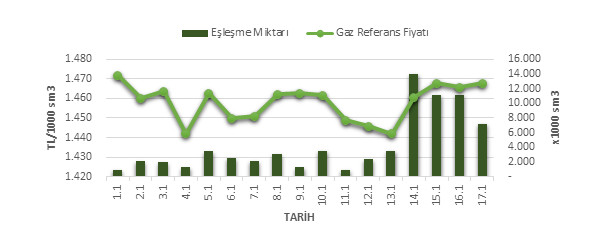 Organize Toptan Doğal Gaz Satış Piyasası (OTSP) dahilinde 01.02.2019 – 17.02.2019 tarihleri arası ortalama Gaz Referans Fiyatı (GRF) 1,457.89 TL/1000 sm3 olarak belirlenirken, aynı tarihler arasında toplam gerçekleşen eşleşmelerin miktarı ise 72,381 x1000 sm3 olarak belirlendi. İlgili tarihler arasında günlük Gaz Referans Fiyatı (GRF) ile Eşleşme Miktarı verileri aşağıdaki grafikte yer almaktadır.