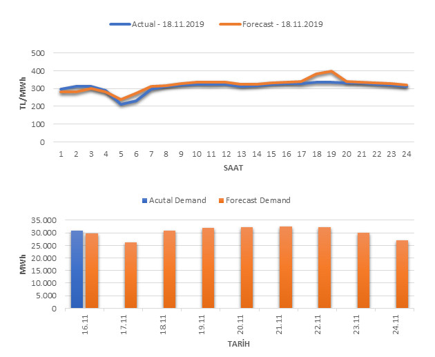 Tahminleme Modeli* analizi sonucu ortalama piyasa takas fiyatı 320.69 TL/MWh ve ortalama tüketim 30,962 MWh olarak öngörülmektedir. Modelin piyasa takas fiyatına dair başarı oranı günlük % 82, tüketime dair başarı oranı** ise günlük % 97 olarak hesaplanırken, bugüne kadar yapılan piyasa takas fiyatına dair analizlere göre başarı oranı % 91, tüketime dair başarı oranı ise % 93 olarak hesaplanmaktadır. Saatlik yarın için oluşan ve tahmin edilen piyasa takas fiyatları ile haftalık bazda tahmin edilen ve gerçekleştikçe yer alacak günlük ortalama tüketim değerleri aşağıdaki grafiklerde yer almaktadır.