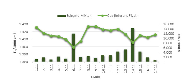Organize Toptan Doğal Gaz Satış Piyasası (OTSP) dahilinde 01.11.2019 – 17.11.2019 tarihleri arası ortalama Gaz Referans Fiyatı (GRF) 1,416.25 TL/1000 sm3 olarak belirlenirken, aynı tarihler arasında toplam gerçekleşen eşleşmelerin miktarı ise 61,480 x1000 sm3 olarak belirlendi. İlgili tarihler arasında günlük Gaz Referans Fiyatı (GRF) ile Eşleşme Miktarı verileri aşağıdaki grafikte yer almaktadır.