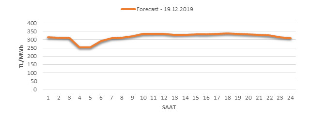 Yarından sonraki gün için oluşacak ortalama piyasa takas fiyatı 317.84 TL/MWH olarak tahmin edilmektedir. Buna bağlı olarak günün maksimum fiyatı 338 TL/MWh olarak 17:0018:00 saat aralığında, minimum fiyatı 254.58 TL/MWh olarak 03:0004:00 saat aralığında gerçekleşeceği öngörülmektedir. Puant saatlerde (17:0022:00) tahmini ortalama piyasa takas fiyatı ise 329.12 TL/MWh olarak hesaplanabilmektedir. Saatlik oluşacak piyasa takas fiyatı tahminleri aşağıdaki grafikte yer almaktadır.