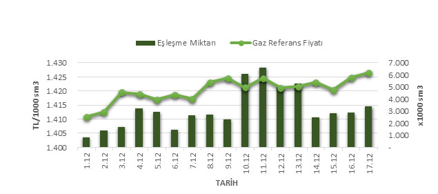 Organize Toptan Doğal Gaz Satış Piyasası (OTSP) dahilinde 01.12.201917.12.2019 tarihleri arası ortalama Gaz Referans Fiyatı (GRF) 1,420.28 TL/1000 sm3 olarak belirlenirken, aynı tarihler arasında toplam gerçekleşen eşleşmelerin miktarı ise 53,904 x1000 sm3 olarak belirlendi. İlgili tarihler arasında günlük Gaz Referans Fiyatı (GRF) ile Eşleşme Miktarı verileri aşağıdaki grafikte yer almaktadır.