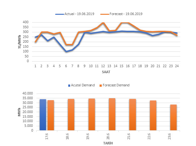 Tahminleme Modeli* analizi sonucu ortalama piyasa takas fiyatı 304.03 TL/MWh ve ortalama tüketim 34,709 MWh olarak öngörülmektedir. Modelin piyasa takas fiyatına dair başarı oranı günlük % 72, tüketime dair başarı oranı** ise günlük % 98 olarak hesaplanırken, bugüne kadar yapılan piyasa takas fiyatına dair analizlere göre başarı oranı % 89, tüketime dair başarı oranı ise % 95 olarak hesaplanmaktadır. Saatlik yarın için oluşan ve tahmin edilen piyasa takas fiyatları ile haftalık bazda tahmin edilen ve gerçekleştikçe yer alacak günlük ortalama tüketim değerleri aşağıdaki grafiklerde yer almaktadır.