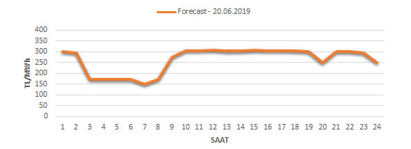 Yarından sonraki gün için oluşacak ortalama piyasa takas fiyatı 263.21 TL/MWH olarak tahmin edilmektedir. Buna bağlı olarak günün maksimum fiyatı 306.8 TL/MWh olarak 11:00 – 12:00 saat aralığında, minimum fiyatı 149.99 TL/MWh olarak 06:00 – 07:00 saat aralığında gerçekleşeceği öngörülmektedir. Puant saatlerde (17:00 – 22:00) tahmini ortalama piyasa takas fiyatı ise 291.02 TL/MWh olarak hesaplanabilmektedir. Saatlik oluşacak piyasa takas fiyatı tahminleri aşağıdaki grafikte yer almaktadır.