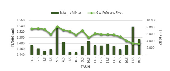 Organize Toptan Doğal Gaz Satış Piyasası (OTSP) dahilinde 01.06.2019 – 18.06.2019 tarihleri arası ortalama Gaz Referans Fiyatı (GRF) 1,512.56 TL/1000 sm3 olarak belirlenirken, aynı tarihler arasında toplam gerçekleşen eşleşmelerin miktarı ise 55,949 x1000 sm3 olarak belirlendi. İlgili tarihler arasında günlük Gaz Referans Fiyatı (GRF) ile Eşleşme Miktarı verileri aşağıdaki grafikte yer almaktadır.
