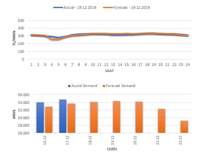 Tahminleme Modeli* analizi sonucu ortalama piyasa takas fiyatı 317.84 TL/MWh ve ortalama tüketim 34,337 MWh olarak öngörülmektedir. Modelin piyasa takas fiyatına dair başarı oranı günlük % 79, tüketime dair başarı oranı** ise günlük % 97 olarak hesaplanırken, bugüne kadar yapılan piyasa takas fiyatına dair analizlere göre başarı oranı % 91, tüketime dair başarı oranı ise % 94 olarak hesaplanmaktadır. Saatlik yarın için oluşan ve tahmin edilen piyasa takas fiyatları ile haftalık bazda tahmin edilen ve gerçekleştikçe yer alacak günlük ortalama tüketim değerleri aşağıdaki grafiklerde yer almaktadır.