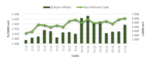 Organize Toptan Doğal Gaz Satış Piyasası (OTSP) dahilinde 01.12.2019 – 18.12.2019 tarihleri arası ortalama Gaz Referans Fiyatı (GRF) 1,420.51 TL/1000 sm3 olarak belirlenirken, aynı tarihler arasında toplam gerçekleşen eşleşmelerin miktarı ise 57,791 x1000 sm3 olarak belirlendi. İlgili tarihler arasında günlük Gaz Referans Fiyatı (GRF) ile Eşleşme Miktarı verileri aşağıdaki grafikte yer almaktadır.