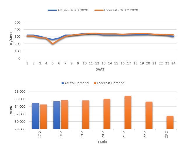 Tahminleme Modeli* analizi sonucu ortalama piyasa takas fiyatı 319 TL/MWh ve ortalama tüketim 36,049 MWh olarak öngörülmektedir. Modelin piyasa takas fiyatına dair başarı oranı günlük % 79, tüketime dair başarı oranı** ise günlük % 99 olarak hesaplanırken, bugüne kadar yapılan piyasa takas fiyatına dair analizlere göre başarı oranı % 91, tüketime dair başarı oranı ise % 94 olarak hesaplanmaktadır. Saatlik yarın için oluşan ve tahmin edilen piyasa takas fiyatları ile haftalık bazda tahmin edilen ve gerçekleştikçe yer alacak günlük ortalama tüketim değerleri aşağıdaki grafiklerde yer almaktadır.