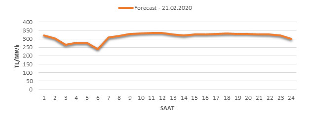 Yarından sonraki gün için oluşacak ortalama piyasa takas fiyatı 314.27 TL/MWH olarak tahmin edilmektedir. Buna bağlı olarak günün maksimum fiyatı 335.75 TL/MWh olarak 11:00 – 12:00 saat aralığında, minimum fiyatı 240.01 TL/MWh olarak 05:00 – 06:00 saat aralığında gerçekleşeceği öngörülmektedir. Puant saatlerde (17:00 – 22:00) tahmini ortalama piyasa takas fiyatı ise 328.05 TL/MWh olarak hesaplanabilmektedir. Saatlik oluşacak piyasa takas fiyatı tahminleri aşağıdaki grafikte yer almaktadır.