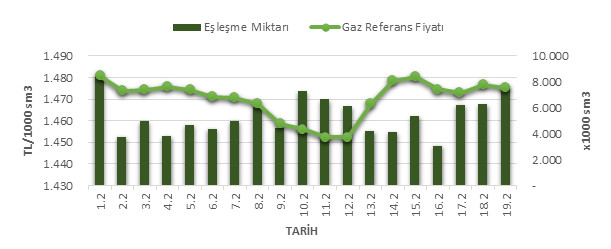 Organize Toptan Doğal Gaz Satış Piyasası (OTSP) dahilinde 01.01.2020 – 19.02.2020 tarihleri arası ortalama Gaz Referans Fiyatı (GRF) 1,470.16 TL/1000 sm3 olarak belirlenirken, aynı tarihler arasında toplam gerçekleşen eşleşmelerin miktarı ise 102,504 x1000 sm3 olarak belirlendi. İlgili tarihler arasında günlük Gaz Referans Fiyatı (GRF) ile Eşleşme Miktarı verileri aşağıdaki grafikte yer almaktadır.