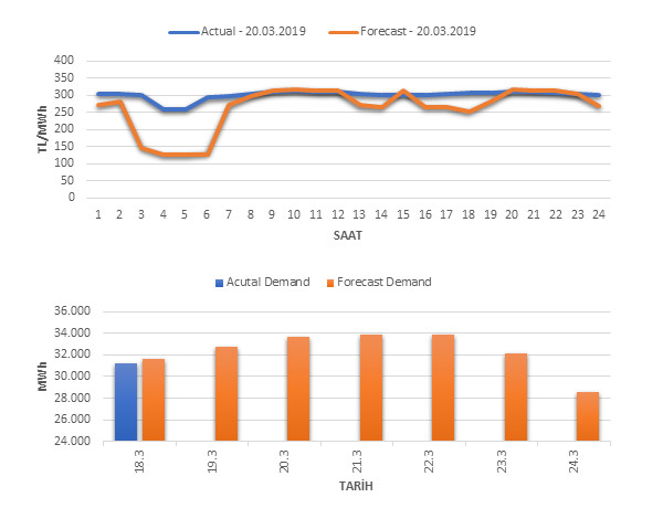Tahminleme Modeli* analizi sonucu ortalama piyasa takas fiyatı 264.45 TL/MWh ve ortalama tüketim 33,644 MWh olarak öngörülmektedir. Modelin piyasa takas fiyatına dair başarı oranı günlük % –15, tüketime dair başarı oranı** ise günlük % 99 olarak hesaplanırken, bugüne kadar yapılan piyasa takas fiyatına dair analizlere göre başarı oranı % 88, tüketime dair başarı oranı ise % 95 olarak hesaplanmaktadır. Saatlik yarın için oluşan ve tahmin edilen piyasa takas fiyatları ile haftalık bazda tahmin edilen ve gerçekleştikçe yer alacak günlük ortalama tüketim değerleri aşağıdaki grafiklerde yer almaktadır.