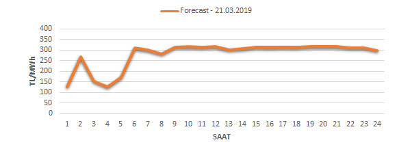 Yarından sonraki gün için oluşacak ortalama piyasa takas fiyatı 281.55 TL/MWH olarak tahmin edilmektedir. Buna bağlı olarak günün maksimum fiyatı 318.15 TL/MWh olarak 19:00 – 20:00 saat aralığında, minimum fiyatı 126.5 TL/MWh olarak 03:00 – 04:00 saat aralığında gerçekleşeceği öngörülmektedir. Puant saatlerde (17:00 – 22:00) tahmini ortalama piyasa takas fiyatı ise 315.25 TL/MWh olarak hesaplanabilmektedir. Saatlik oluşacak piyasa takas fiyatı tahminleri aşağıdaki grafikte yer almaktadır.