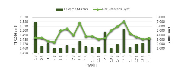 Organize Toptan Doğal Gaz Satış Piyasası (OTSP) dahilinde 01.03.2019 – 19.03.2019 tarihleri arası ortalama Gaz Referans Fiyatı (GRF) 1,491.97 TL/1000 sm3 olarak belirlenirken, aynı tarihler arasında toplam gerçekleşen eşleşmelerin miktarı ise 45,999 x1000 sm3 olarak belirlendi. İlgili tarihler arasında günlük Gaz Referans Fiyatı (GRF) ile Eşleşme Miktarı verileri aşağıdaki grafikte yer almaktadır.