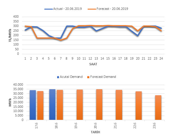 Tahminleme Modeli* analizi sonucu ortalama piyasa takas fiyatı 263.21 TL/MWh ve ortalama tüketim 34,921 MWh olarak öngörülmektedir. Modelin piyasa takas fiyatına dair başarı oranı günlük % 64, tüketime dair başarı oranı** ise günlük % 98 olarak hesaplanırken, bugüne kadar yapılan piyasa takas fiyatına dair analizlere göre başarı oranı % 89, tüketime dair başarı oranı ise % 95 olarak hesaplanmaktadır. Saatlik yarın için oluşan ve tahmin edilen piyasa takas fiyatları ile haftalık bazda tahmin edilen ve gerçekleştikçe yer alacak günlük ortalama tüketim değerleri aşağıdaki grafiklerde yer almaktadır.