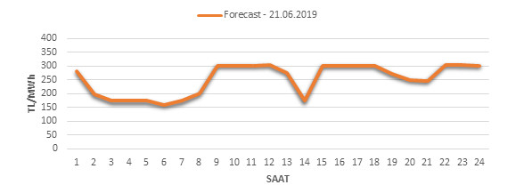 Yarından sonraki gün için oluÅŸacak ortalama piyasa takas fiyatı 252.36 TL/MWH olarak tahmin edilmektedir. Buna baÄŸlı olarak günün maksimum fiyatı 303.13 TL/MWh olarak 21:00 – 22:00 saat aralığında, minimum fiyatı 160.63 TL/MWh olarak 05:00 – 06:00 saat aralığında gerçekleÅŸeceÄŸi öngörülmektedir. Puant saatlerde (17:00 – 22:00) tahmini ortalama piyasa takas fiyatı ise 278.53 TL/MWh olarak hesaplanabilmektedir. Saatlik oluÅŸacak piyasa takas fiyatı tahminleri aÅŸağıdaki grafikte yer almaktadır.