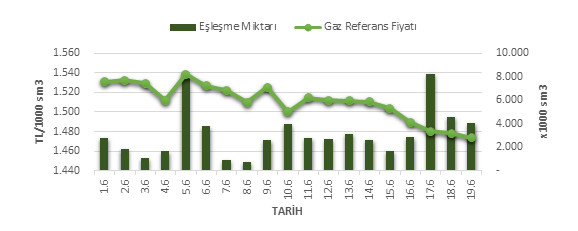 Organize Toptan Doğal Gaz Satış Piyasası (OTSP) dahilinde 01.06.2019 – 19.06.2019 tarihleri arası ortalama Gaz Referans Fiyatı (GRF) 1,510.5 TL/1000 sm3 olarak belirlenirken, aynı tarihler arasında toplam gerçekleşen eşleşmelerin miktarı ise 60,034 x1000 sm3 olarak belirlendi. İlgili tarihler arasında günlük Gaz Referans Fiyatı (GRF) ile Eşleşme Miktarı verileri aşağıdaki grafikte yer almaktadır.