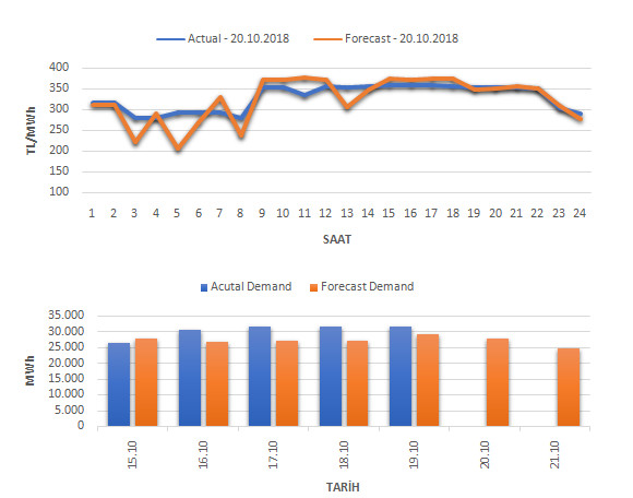 Tahminleme Modeli* analizi sonucu ortalama piyasa takas fiyatı 324,94 TL/MWh ve ortalama tüketim 27.923 MWh olarak öngörülmektedir. Modelin piyasa takas fiyatına dair başarı oranı günlük % 62, tüketime dair başarı oranı** ise günlük %86 olarak hesaplanırken, bugüne kadar yapılan piyasa takas fiyatına dair analizlere göre başarı oranı % 86, tüketime dair başarı oranı ise % 90 olarak hesaplanmaktadır. Saatlik yarın için oluşan ve tahmin edilen piyasa takas fiyatları ile haftalık bazda tahmin edilen ve gerçekleştikçe yer alacak günlük ortalama tüketim değerleri aşağıdaki grafiklerde yer almaktadır.