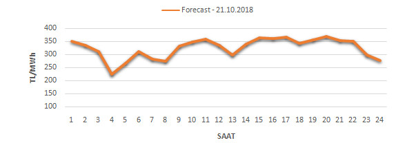 Gün öncesi elektrik piyasasında yarın için oluşan megavat saat (MWh) başına piyasa takas fiyatı ortalaması 328,88 TL olarak belirlendi.Fiyatlardaki dağılıma bakıldığında, günün maksimum fiyatı 358,42 TL/MWh olarak 14:00 – 15:00 saat aralığında, minimum fiyatı 279,99 TL/MWh olarak 03:00 – 04:00 saat aralığında gerçekleşti. Puant saatlerde (17:00 – 22:00) ortalama piyasa takas fiyatı ise 344,94 TL/MWh olarak hesaplanabilmektedir.