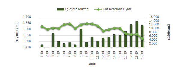 Organize Toptan Doğal Gaz Satış Piyasası (OTSP) dahilinde 01.10.2018 – 19.10.2018 tarihleri arası ortalama Gaz Referans Fiyatı (GRF) 1.605,93 TL /1000 sm3 olarak belirlenirken, aynı tarihler arasında toplam gerçekleşen eşleşmelerin miktarı ise 109.847 x 1000 sm3 olarak belirlendi. İlgili tarihler arasında günlük Gaz Referans Fiyatı (GRF) ile Eşleşme Miktarı verileri aşağıdaki grafikte yer almaktadır.