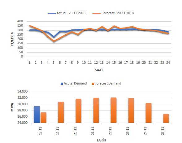 Tahminleme Modeli* analizi sonucu ortalama piyasa takas fiyatı 292.92 TL/MWh ve ortalama tüketim 31,751 MWh olarak öngörülmektedir. Modelin piyasa takas fiyatına dair başarı oranı günlük % 64, tüketime dair başarı oranı** ise günlük % 93 olarak hesaplanırken, bugüne kadar yapılan piyasa takas fiyatına dair analizlere göre başarı oranı % 87, tüketime dair başarı oranı ise % 92 olarak hesaplanmaktadır. Saatlik yarın için oluşan ve tahmin edilen piyasa takas fiyatları ile haftalık bazda tahmin edilen ve gerçekleştikçe yer alacak günlük ortalama tüketim değerleri aşağıdaki grafiklerde yer almaktadır.