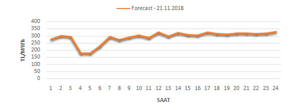 Yarından sonraki gün için oluşacak ortalama piyasa takas fiyatı 289.5 TL/MWH olarak tahmin edilmektedir. Buna bağlı olarak günün maksimum fiyatı 326.17 TL/MWh olarak 23:00 – Avg.:00 saat aralığında, minimum fiyatı 174.01 TL/MWh olarak 03:0004:00 saat aralığında gerçekleşeceği öngörülmektedir. Puant saatlerde (17:0022:00) tahmini ortalama piyasa takas fiyatı ise 313.8 TL/MWh olarak hesaplanabilmektedir. Saatlik oluşacak piyasa takas fiyatı tahminleri aşağıdaki grafikte yer almaktadır.