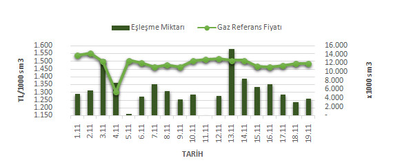 Organize Toptan Doğal Gaz Satış Piyasası (OTSP) dahilinde 01.10.201819.11.2018 tarihleri arası ortalama Gaz Referans Fiyatı (GRF) 1,483.92 TL/1000 sm3 olarak belirlenirken, aynı tarihler arasında toplam gerçekleşen eşleşmelerin miktarı ise 110,147 x1000 sm3 olarak belirlendi. İlgili tarihler arasında günlük Gaz Referans Fiyatı (GRF) ile Eşleşme Miktarı verileri aşağıdaki grafikte yer almaktadır.