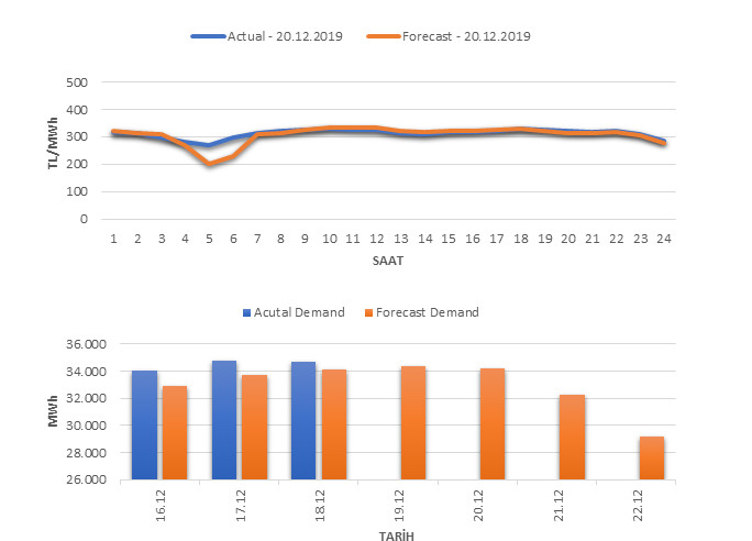 Tahminleme Modeli* analizi sonucu ortalama piyasa takas fiyatı 308.86 TL/MWh ve ortalama tüketim 34,180 MWh olarak öngörülmektedir. Modelin piyasa takas fiyatına dair başarı oranı günlük % 65, tüketime dair başarı oranı** ise günlük % 98 olarak hesaplanırken, bugüne kadar yapılan piyasa takas fiyatına dair analizlere göre başarı oranı % 91, tüketime dair başarı oranı ise % 94 olarak hesaplanmaktadır. Saatlik yarın için oluşan ve tahmin edilen piyasa takas fiyatları ile haftalık bazda tahmin edilen ve gerçekleştikçe yer alacak günlük ortalama tüketim değerleri aşağıdaki grafiklerde yer almaktadır.