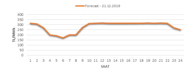 Yarından sonraki gün için oluşacak ortalama piyasa takas fiyatı 280.34 TL/MWH olarak tahmin edilmektedir. Buna bağlı olarak günün maksimum fiyatı 316.93 TL/MWh olarak 11:00 – 12:00 saat aralığında, minimum fiyatı 169.99 TL/MWh olarak 05:00 – 06:00 saat aralığında gerçekleşeceği öngörülmektedir. Puant saatlerde (17:00 – 22:00) tahmini ortalama piyasa takas fiyatı ise 307.19 TL/MWh olarak hesaplanabilmektedir. Saatlik oluşacak piyasa takas fiyatı tahminleri aşağıdaki grafikte yer almaktadır.