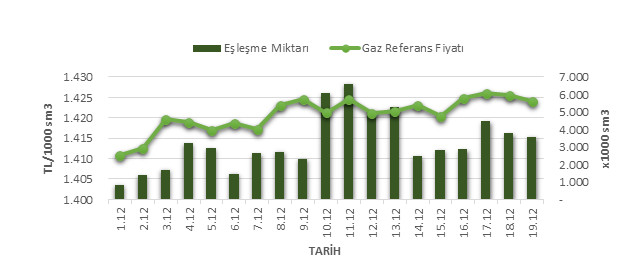 Organize Toptan Doğal Gaz Satış Piyasası (OTSP) dahilinde 01.12.2019 – 19.12.2019 tarihleri arası ortalama Gaz Referans Fiyatı (GRF) 1,420.72 TL/1000 sm3 olarak belirlenirken, aynı tarihler arasında toplam gerçekleşen eşleşmelerin miktarı ise 62,325 x1000 sm3 olarak belirlendi. İlgili tarihler arasında günlük Gaz Referans Fiyatı (GRF) ile Eşleşme Miktarı verileri aşağıdaki grafikte yer almaktadır.