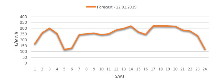 Yarından sonraki gün için oluşacak ortalama piyasa takas fiyatı 253.53 TL/MWH olarak tahmin edilmektedir. Buna bağlı olarak günün maksimum fiyatı 319.2 TL/MWh olarak 17:0018:00 saat aralığında, minimum fiyatı 117.25 TL/MWh olarak 04:0005:00 saat aralığında gerçekleşeceği öngörülmektedir. Puant saatlerde (17:0022:00) tahmini ortalama piyasa takas fiyatı ise 291.86 TL/MWh olarak hesaplanabilmektedir. Saatlik oluşacak piyasa takas fiyatı tahminleri aşağıdaki grafikte yer almaktadır.