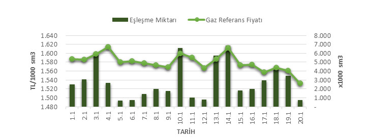 Organize Toptan Doğal Gaz Satış Piyasası (OTSP) dahilinde 01.12.201820.01.2019 tarihleri arası ortalama Gaz Referans Fiyatı (GRF) 1,579.82 TL/1000 sm3 olarak belirlenirken, aynı tarihler arasında toplam gerçekleşen eşleşmelerin miktarı ise 56,670 x1000 sm3 olarak belirlendi. İlgili tarihler arasında günlük Gaz Referans Fiyatı (GRF) ile Eşleşme Miktarı verileri aşağıdaki grafikte yer almaktadır.