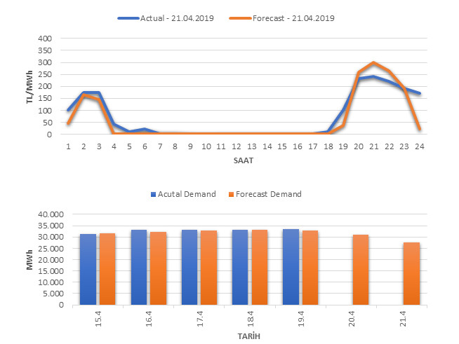 Tahminleme Modeli* analizi sonucu ortalama piyasa takas fiyatı 59.43 TL/MWh ve ortalama tüketim 27,447 MWh olarak öngörülmektedir. Modelin piyasa takas fiyatına dair başarı oranı günlük % 83, tüketime dair başarı oranı** ise günlük % 98 olarak hesaplanırken, bugüne kadar yapılan piyasa takas fiyatına dair analizlere göre başarı oranı % 88, tüketime dair başarı oranı ise % 95 olarak hesaplanmaktadır. Saatlik yarın için oluşan ve tahmin edilen piyasa takas fiyatları ile haftalık bazda tahmin edilen ve gerçekleştikçe yer alacak günlük ortalama tüketim değerleri aşağıdaki grafiklerde yer almaktadır.