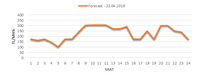 Yarından sonraki gün için oluşacak ortalama piyasa takas fiyatı 226.06 TL/MWH olarak tahmin edilmektedir. Buna bağlı olarak günün maksimum fiyatı 305.68 TL/MWh olarak 11:00 – 12:00 saat aralığında, minimum fiyatı 100.91 TL/MWh olarak 04:00 – 05:00 saat aralığında gerçekleşeceği öngörülmektedir. Puant saatlerde (17:00 – 22:00) tahmini ortalama piyasa takas fiyatı ise 252.43 TL/MWh olarak hesaplanabilmektedir. Saatlik oluşacak piyasa takas fiyatı tahminleri aşağıdaki grafikte yer almaktadır.