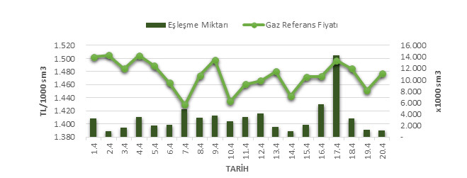 Organize Toptan Doğal Gaz Satış Piyasası (OTSP) dahilinde 01.03.2019 – 20.04.2019 tarihleri arası ortalama Gaz Referans Fiyatı (GRF) 1,474.3 TL/1000 sm3 olarak belirlenirken, aynı tarihler arasında toplam gerçekleşen eşleşmelerin miktarı ise 66,384 x1000 sm3 olarak belirlendi. İlgili tarihler arasında günlük Gaz Referans Fiyatı (GRF) ile Eşleşme Miktarı verileri aşağıdaki grafikte yer almaktadır.