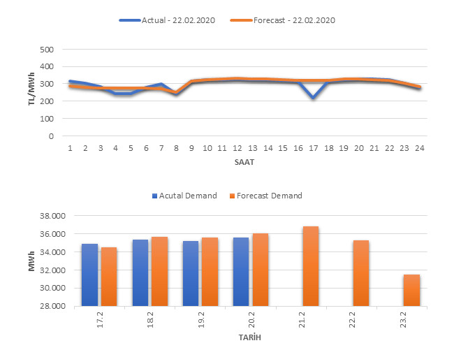 Tahminleme Modeli* analizi sonucu ortalama piyasa takas fiyatı 305.82 TL/MWh ve ortalama tüketim 35,285 MWh olarak öngörülmektedir. Modelin piyasa takas fiyatına dair başarı oranı günlük % 78, tüketime dair başarı oranı** ise günlük % 99 olarak hesaplanırken, bugüne kadar yapılan piyasa takas fiyatına dair analizlere göre başarı oranı % 91, tüketime dair başarı oranı ise % 94 olarak hesaplanmaktadır. Saatlik yarın için oluşan ve tahmin edilen piyasa takas fiyatları ile haftalık bazda tahmin edilen ve gerçekleştikçe yer alacak günlük ortalama tüketim değerleri aşağıdaki grafiklerde yer almaktadır.