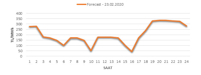 Yarından sonraki gün için oluşacak ortalama piyasa takas fiyatı 203.3 TL/MWH olarak tahmin edilmektedir. Buna bağlı olarak günün maksimum fiyatı 334.99 TL/MWh olarak 19:00 – 20:00 saat aralığında, minimum fiyatı 42.91 TL/MWh olarak 15:00 – 16:00 saat aralığında gerçekleşeceği öngörülmektedir. Puant saatlerde (17:00 – 22:00) tahmini ortalama piyasa takas fiyatı ise 315.16 TL/MWh olarak hesaplanabilmektedir. Saatlik oluşacak piyasa takas fiyatı tahminleri aşağıdaki grafikte yer almaktadır.