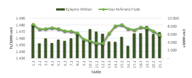 Organize Toptan Doğal Gaz Satış Piyasası (OTSP) dahilinde 01.01.2020 – 21.02.2020 tarihleri arası ortalama Gaz Referans Fiyatı (GRF) 1,469.93 TL/1000 sm3 olarak belirlenirken, aynı tarihler arasında toplam gerçekleşen eşleşmelerin miktarı ise 115,388 x1000 sm3 olarak belirlendi. İlgili tarihler arasında günlük Gaz Referans Fiyatı (GRF) ile Eşleşme Miktarı verileri aşağıdaki grafikte yer almaktadır.