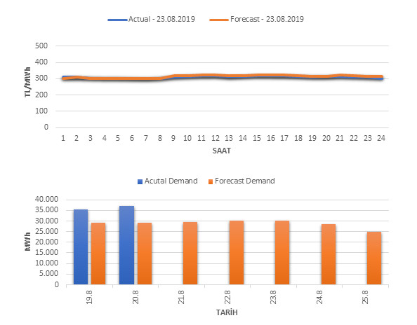 Tahminleme Modeli* analizi sonucu ortalama piyasa takas fiyatı 315.06 TL/MWh ve ortalama tüketim 30,040 MWh olarak öngörülmektedir. Modelin piyasa takas fiyatına dair başarı oranı günlük % 68, tüketime dair başarı oranı** ise günlük % 79 olarak hesaplanırken, bugüne kadar yapılan piyasa takas fiyatına dair analizlere göre başarı oranı % 91, tüketime dair başarı oranı ise % 94 olarak hesaplanmaktadır. Saatlik yarın için oluşan ve tahmin edilen piyasa takas fiyatları ile haftalık bazda tahmin edilen ve gerçekleştikçe yer alacak günlük ortalama tüketim değerleri aşağıdaki grafiklerde yer almaktadır.