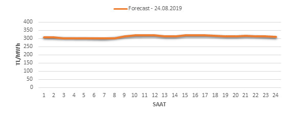 Yarından sonraki gün için oluşacak ortalama piyasa takas fiyatı 312.76 TL/MWH olarak tahmin edilmektedir. Buna bağlı olarak günün maksimum fiyatı 320.49 TL/MWh olarak 16:00 – 17:00 saat aralığında, minimum fiyatı 301.3 TL/MWh olarak 06:00 – 07:00 saat aralığında gerçekleşeceği öngörülmektedir. Puant saatlerde (17:00 – 22:00) tahmini ortalama piyasa takas fiyatı ise 315.52 TL/MWh olarak hesaplanabilmektedir. Saatlik oluşacak piyasa takas fiyatı tahminleri aşağıdaki grafikte yer almaktadır.