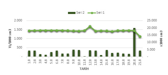 Organize Toptan Doğal Gaz Satış Piyasası (OTSP) dahilinde 01.08.2019 – 22.08.2019 tarihleri arası ortalama Gaz Referans Fiyatı (GRF) 1,439.15 TL/1000 sm3 olarak belirlenirken, aynı tarihler arasında toplam gerçekleşen eşleşmelerin miktarı ise 81,335 x1000 sm3 olarak belirlendi. İlgili tarihler arasında günlük Gaz Referans Fiyatı (GRF) ile Eşleşme Miktarı verileri aşağıdaki grafikte yer almaktadır.