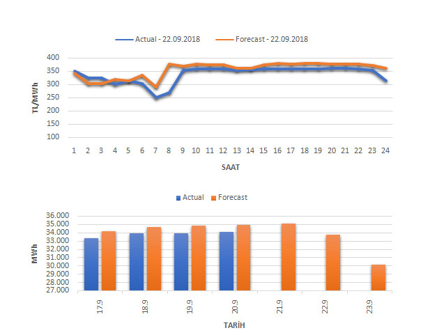 Tahminleme Modeli* analizi sonucu ortalama piyasa takas fiyatı 356,39TL/MWh ve ortalama tüketim 33.725 MWh olarak öngörülmektedir. Modelin piyasa takas fiyatına dair başarı oranı günlük% 72, tüketime dair başarı oranı isegünlük % 98 olarak hesaplanırken, bugüne kadar yapılan piyasa takas fiyatına dair analizlere göre başarı oranı % 78,tüketime dair başarı oranı ise % 92 olarak hesaplanmaktadır. Saatlik yarın için oluşan ve tahmin edilen piyasa takas fiyatları ile haftalık bazda tahmin edilenve gerçekleştikçe yer alacak günlük ortalama tüketim değerleri aşağıdaki grafiklerde yer almaktadır.
